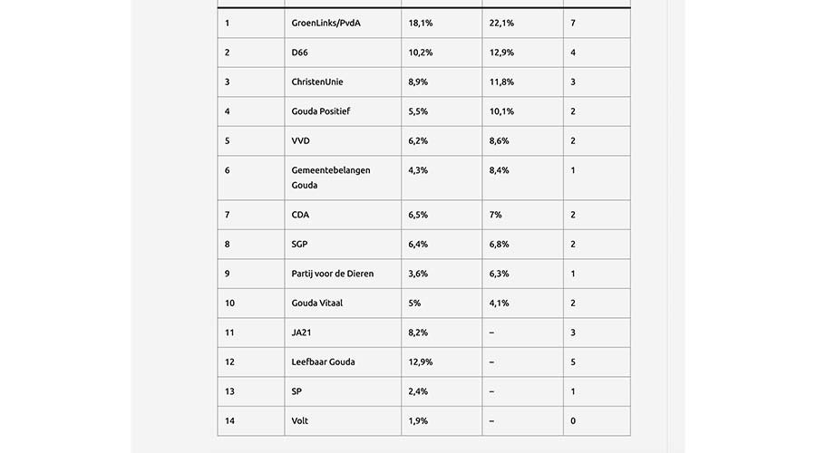 Op woensdag 18 maart 2026 waren de gemeenteraadsverkiezingen. Ook in Gouda gingen veel inwoners stemmen voor de nieuwe gemeenteraad. De voorlopige uitslag is ondertussen bekend. De coalitie van GroenLinks-PvdA, D66, ChristenUnie en CDA heeft de meerderheid verloren in Gouda. GroenLinks-PvdA is met zeven zetels de grootste geworden.